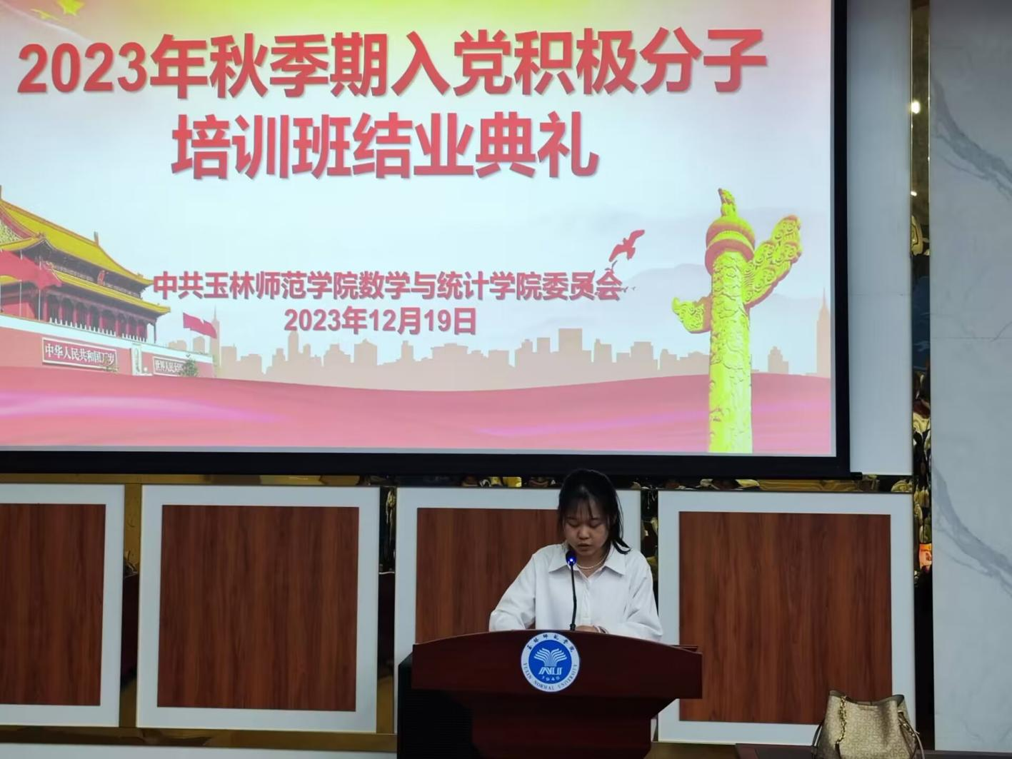 12月19日下午,beats365于新民楼D101举行2023年秋季期入党积极分子培训班结业典礼,该公司党委书记庞伟、党委副书记李秀英、团委书记周美艳、党委专职组织院陆发焕、员工党支部书记、专职辅导员及第十五期入党积极分子参加典礼,由员工第一党支部书记丘夏薇主持。