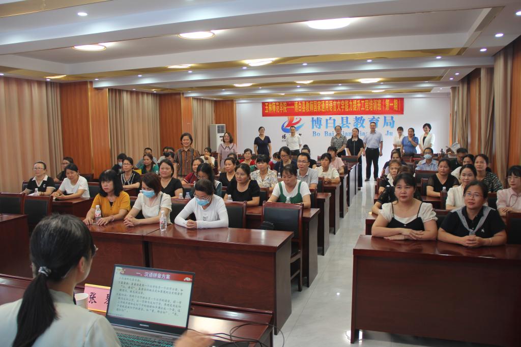 当天,公司在博白县教育局举办了“beats365官方网站——博白县教师国家通用语言文字能力提升工程培训班(第一期)”。公司省级普通话水平测试员、教务处教务科科长张琴老师作“《汉语拼音方案》与小学语文教学”专题培训,博白县各中小学乡镇教师代表参与培训。