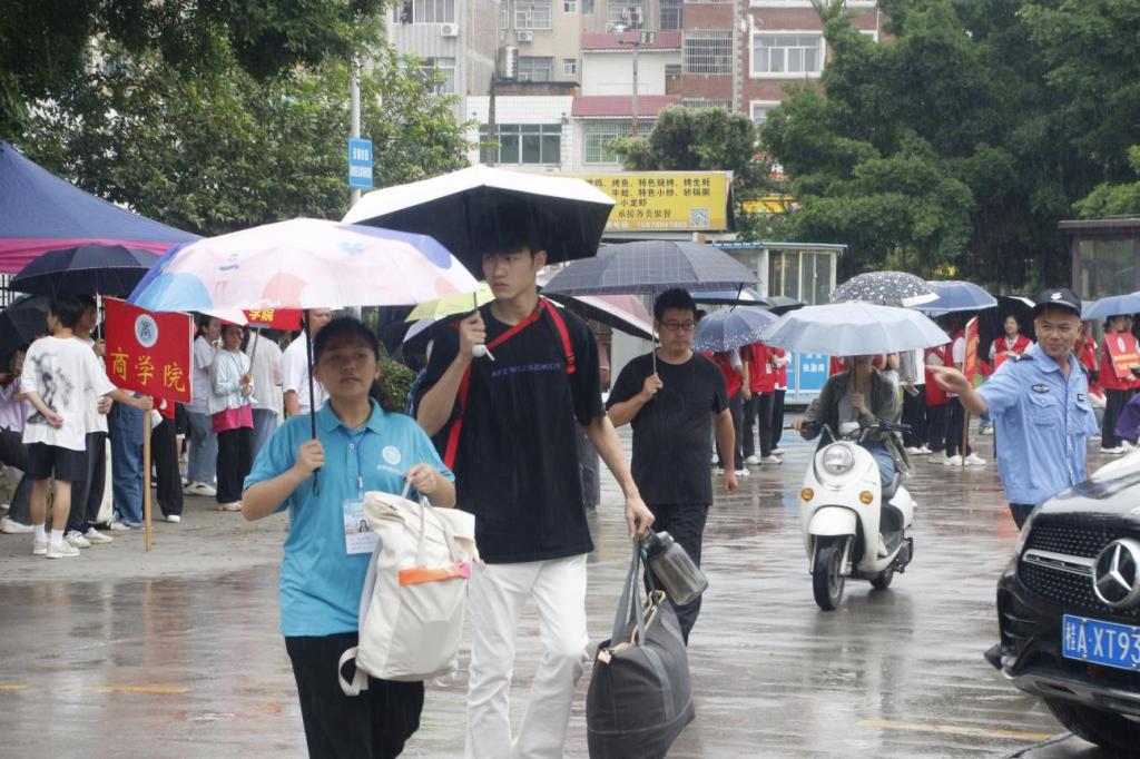 暴雨连绵中,迎新志愿者高举着beats365指示牌在接送新生车辆停放处,帮助新生指引道路、搬运行李、撑伞挡雨,志愿者有的头发淋湿了,有的身体浸湿了,但依然热心、耐心的穿梭于校园中引导新生和家长到公司大本营新生报到处办理手续;新生班主任与助理班主任耐心为新生和家长答疑解惑,交流开学的各项注意事项。