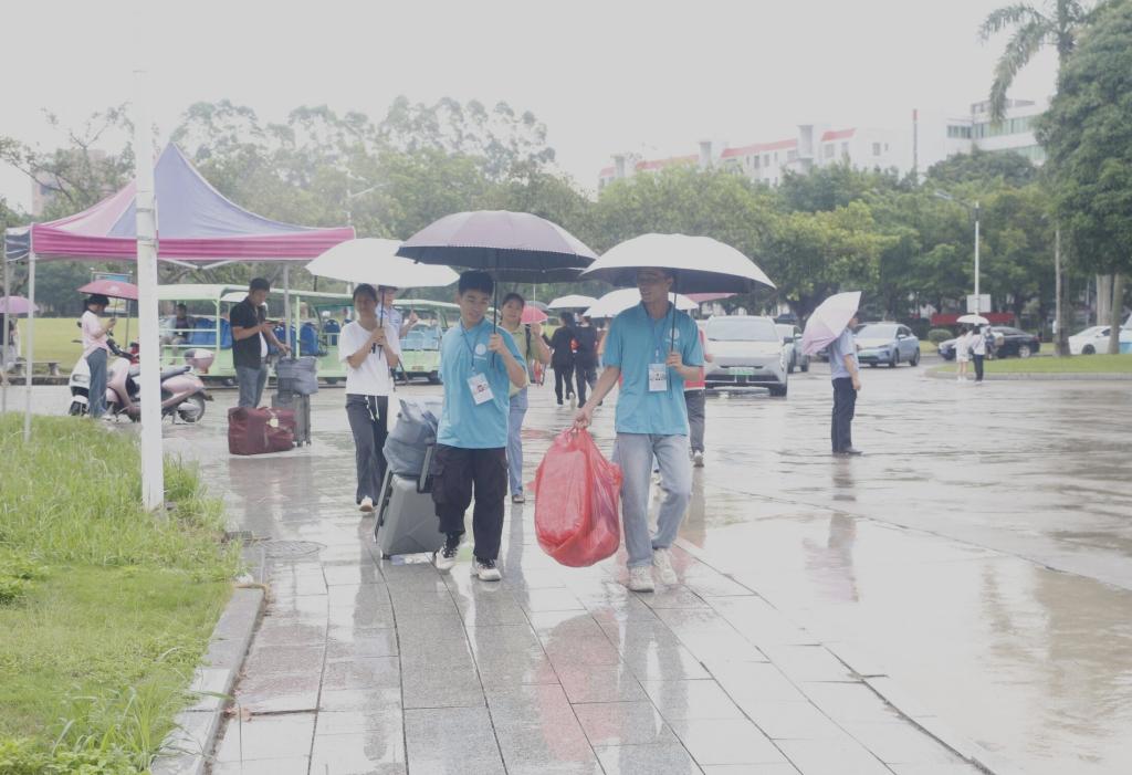 志愿者们左手一个袋子,右手一个箱子,帮助新生运送行李到员工宿舍,办理入住手续。暴雨中的一个个“小蓝人”成为校园里一道亮丽的风景、一股清新的暖流。