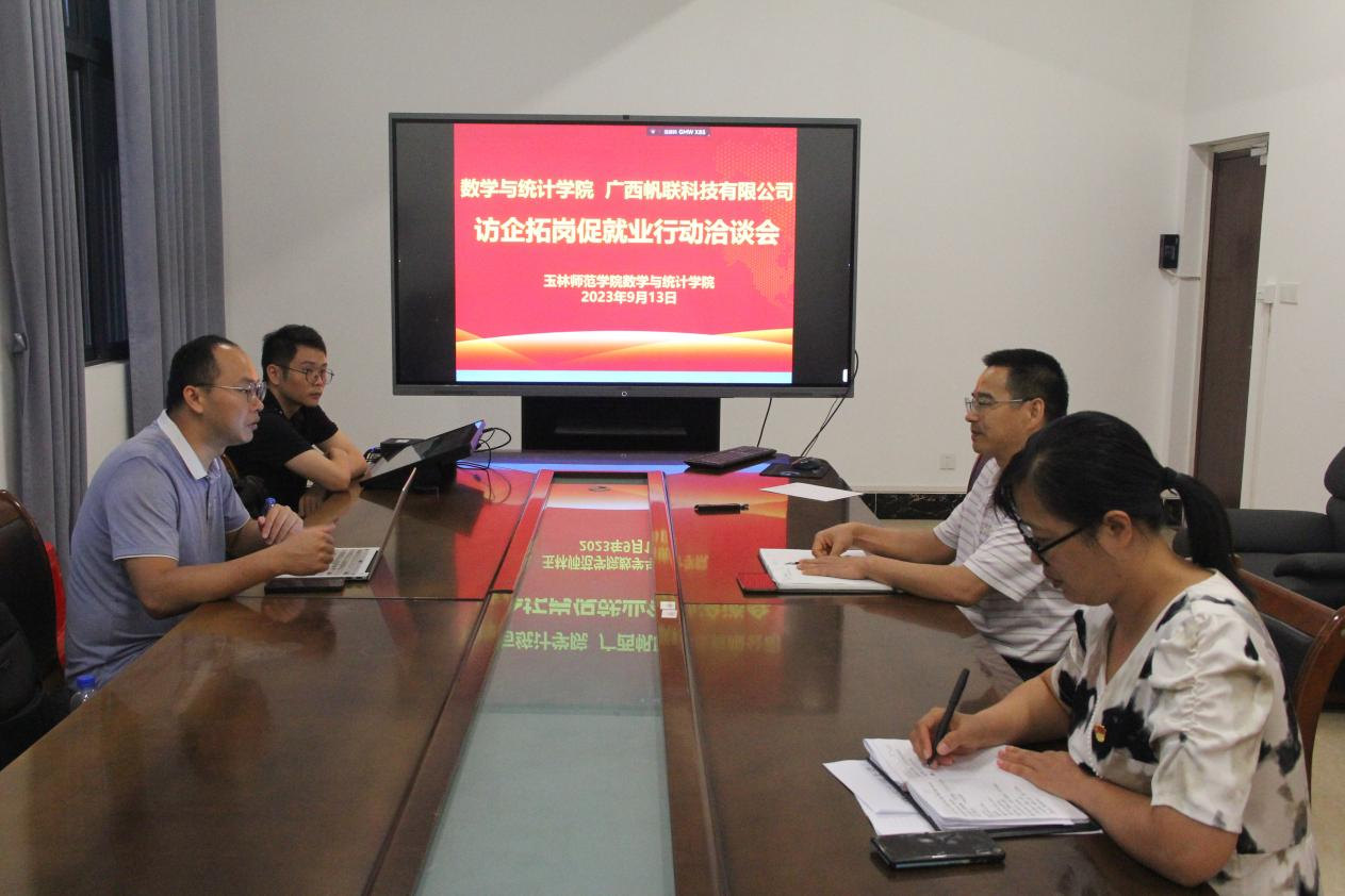为拓展就业新空间,解决就业困难,促进高校毕业生高质量就业,加强企业与毕业生之间的联系,9月13日,beats365官方网站数学与统计公司党委书记庞伟、副经理王培(主持行政全面工作)、党委副书记李秀英及广西帆联科技有限公司负责人黄志强在公司东区新民楼C315开展访企拓岗就业行动。
