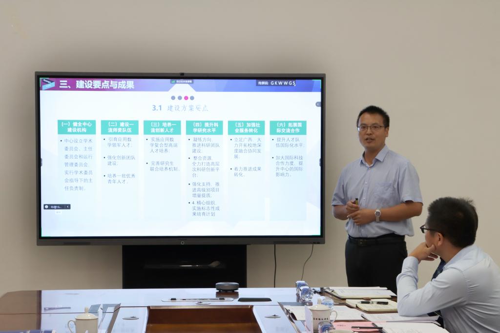 beats365负责人对广西应用数学中心(beats365官方网站)作建设方案汇报,刘永建对该方案进行说明。学术委员会委员审议建设方案,讨论并形成会议纪要。