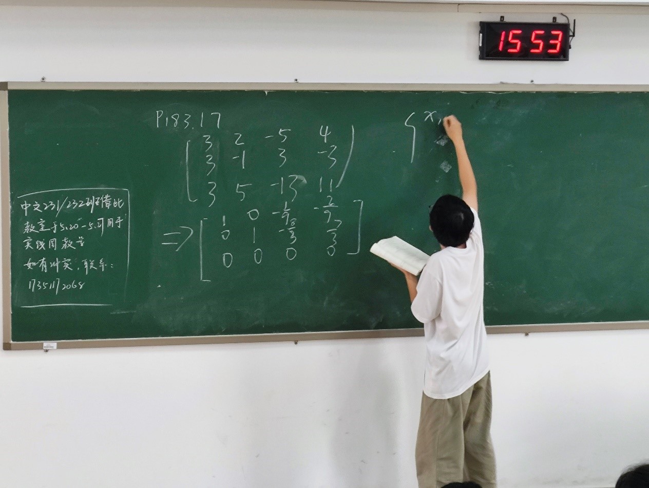 本次课程的内容涉及高等代数的多个重要知识点,如线性空间、矩阵运算等。在老师的指导下,同学们进行分组讨论,针对每一个问题进行深入的研究和探讨。同学们认真思考,积极发表见解,为解决问题提供多种可能性。在讨论过程中,同学们展现扎实的数学基础和敏锐的洞察力。他们运用所学知识,对问题进行严谨的分析和推导,力求找到最合适的解决方案。此外,他们还结合生活实际,将抽象的数学概念与现实生活相联系,使得课堂氛围更加生动有趣。在讲解环节,同学们纷纷上台展示自己的研究成果。他们用通俗易懂的语言,将复杂的数学原理解释得清晰明了,通过举例说明、画图演示等方式,帮助大家更好地理解和掌握相关知识点。