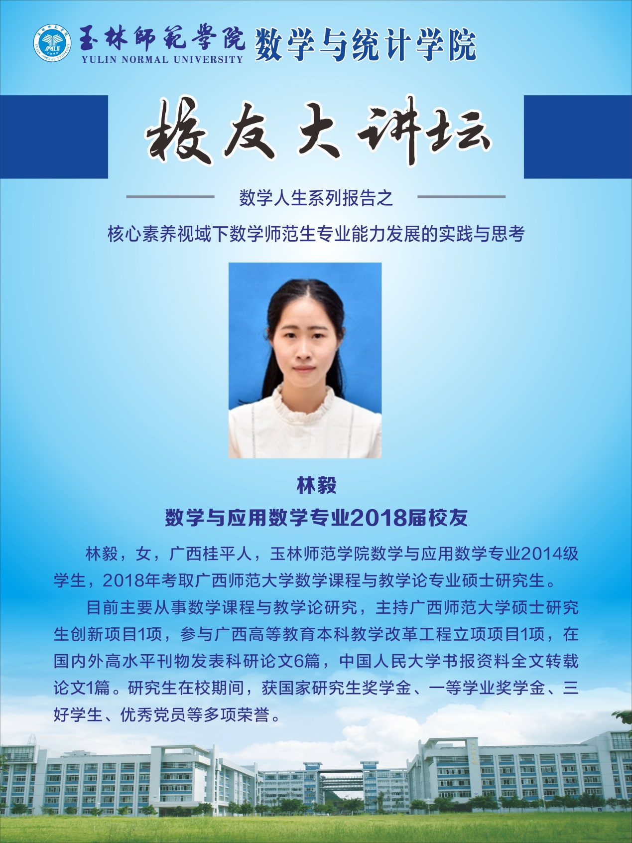 林毅以“树立目标,心沉努力”、“发现成就,享受过程”两个方面为切入点,具体阐述了数学师范生必须要具备基础能力、数学能力、数学教学能力和教育科研能力,要求数学师范生多看、多练、多反思。她指出在核心素养视域下数学师范生要通过实践发展专业能力,并以自身为例,分享考研经历,鼓励数学师范生在未来的规划上树立目标、心沉努力,建议师范生不要过度追求结果,要发现成就,享受过程
